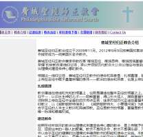 费城圣经归正教会成立于2009年11月。2012年9月9日按美国改革宗长老会之信条和治会章程被美国长老会接受成为一间美国长老会教会。