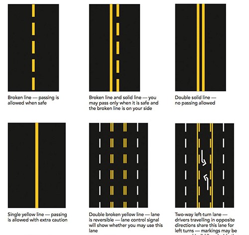 道路中央的黄色虚线将双方向行进的车流分隔开来。在确保安全情况下,驾驶可越过该虚线超车或左转驶入另一条路或私人车道。