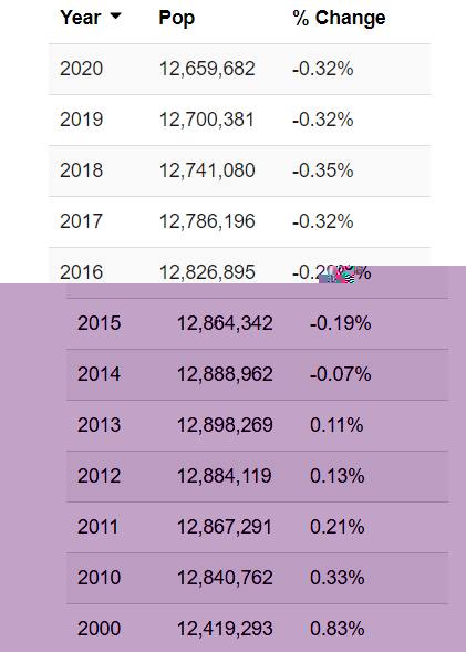 2019年伊利诺伊州的人口估计为1,270万。 2015年的人口普查估计人口为12,859,995,较2014年的人数有所下降。 伊利诺伊州是2016年仅有的七个负增长率的州之一。年增长率为-0.17%,仅次于西弗吉尼亚州。 在2000年至2010年之间,伊利诺伊州的人口仅增长了3.3%,而美国的全国平均人口增长率为9.7%。