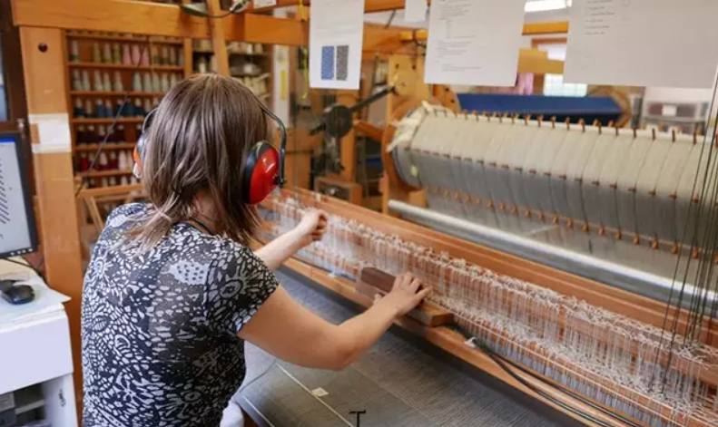 这里的织物都是在缅因州诺斯波特的工作室纺织机上手工制成的;每年品牌都会推出一款限量版毛毯。图中,一个纺织工正在制作 75 件限量版 Whitecaps 毛毯中的一件,毛毯上的图案以拍打在佩诺布斯克特湾岸的白色浪花为灵感创作。