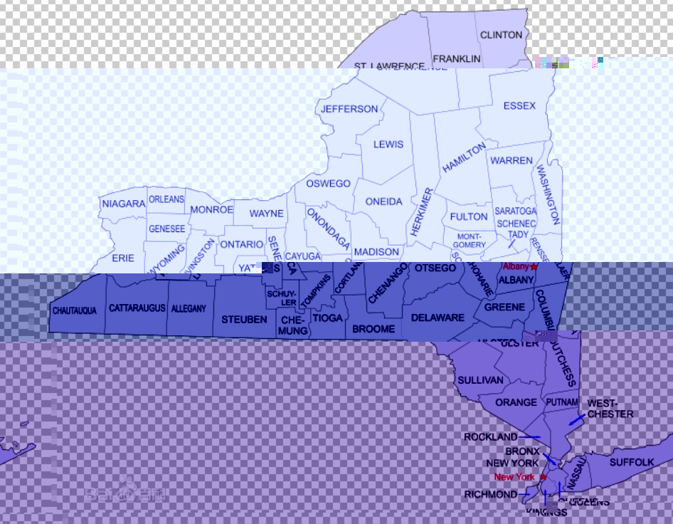 纽约州可区分为七大地理区域:圣罗伦斯低地区、艾迪朗戴克高地区、大湖低地区、哈德逊-莫哈克低地区、新英格兰高地区、大西洋沿岸平原区、以及阿帕拉契高原区。该州主要的城市有:纽约市(New York City)、水牛城/布法罗(Buffalo)、罗切斯特/洛彻斯特(Rochester)、杨克斯(Yonkers)、雪城(Syracuse)、以及州首府奥尔巴尼(Albany)。