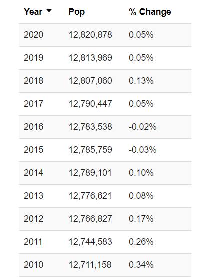 据估计,宾夕法尼亚州的人口在2019年已超过1281万,比2010年的人口普查数字1270万略有增加。 宾夕法尼亚州目前的增长率仅为0.24%,在全美排名第42位。 对2019年人口的估计显示,宾夕法尼亚州有1281万居民,是美国人口第六大州。
